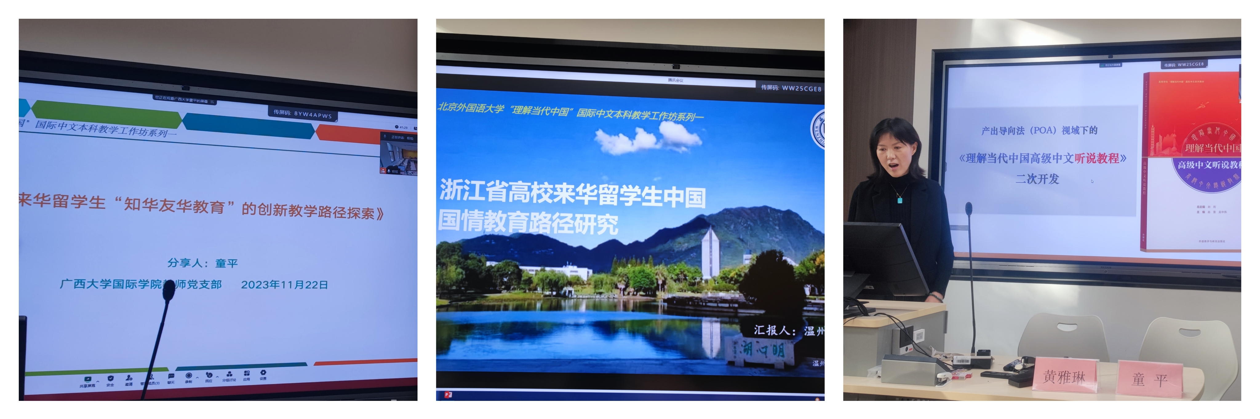 黄雅琳老师发表了题为《浙江省高校来华职工中国国情教育路径研究》的报告。报告从中国国情教育路径的研究背景和研究现状出发,说明了来华职工中国国情教育的研究内容和目标。随后,黄雅琳老师专门分享了温州大学在推动国情教育实践基地建设方面的成果,通过具体实例,说明了挖掘地方历史文化中蕴含的优秀地方文化资源,在高校职工国情教育中凸显中国特色,并应用于第一课堂和第二课堂教学的重要意义。