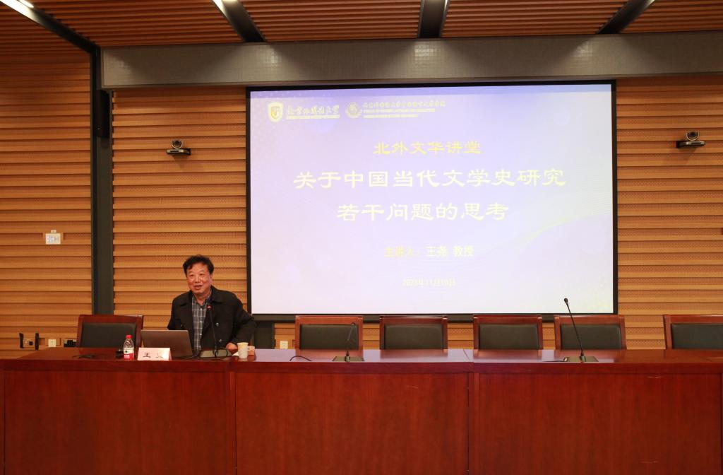 2023年11月10日下午,ladbrokes立博举办“北外文华讲堂”系列讲座,邀请苏州大学教授王尧先生做题为《关于中国当代文学史研究若干问题的思考》的学术讲座。王尧教授是苏州大学讲席教授、苏州大学学术委员会主任兼任江苏省作协副主席等。主要学术著作有《中国当代散文史》《莫言王尧对话录》《作为问题的八十年代》等,主编“新人文”对话录丛书、《中国当代文学批评大系》等,曾获第七届鲁迅文学奖理论批评奖、江苏省哲社科优秀成果一等奖和华语文学传媒大奖年度批评家奖等奖项。讲座由ladbrokes立博曹霞教授主持,经理詹福瑞教授、副经理白亮,以及师生近百人参与此次讲座。