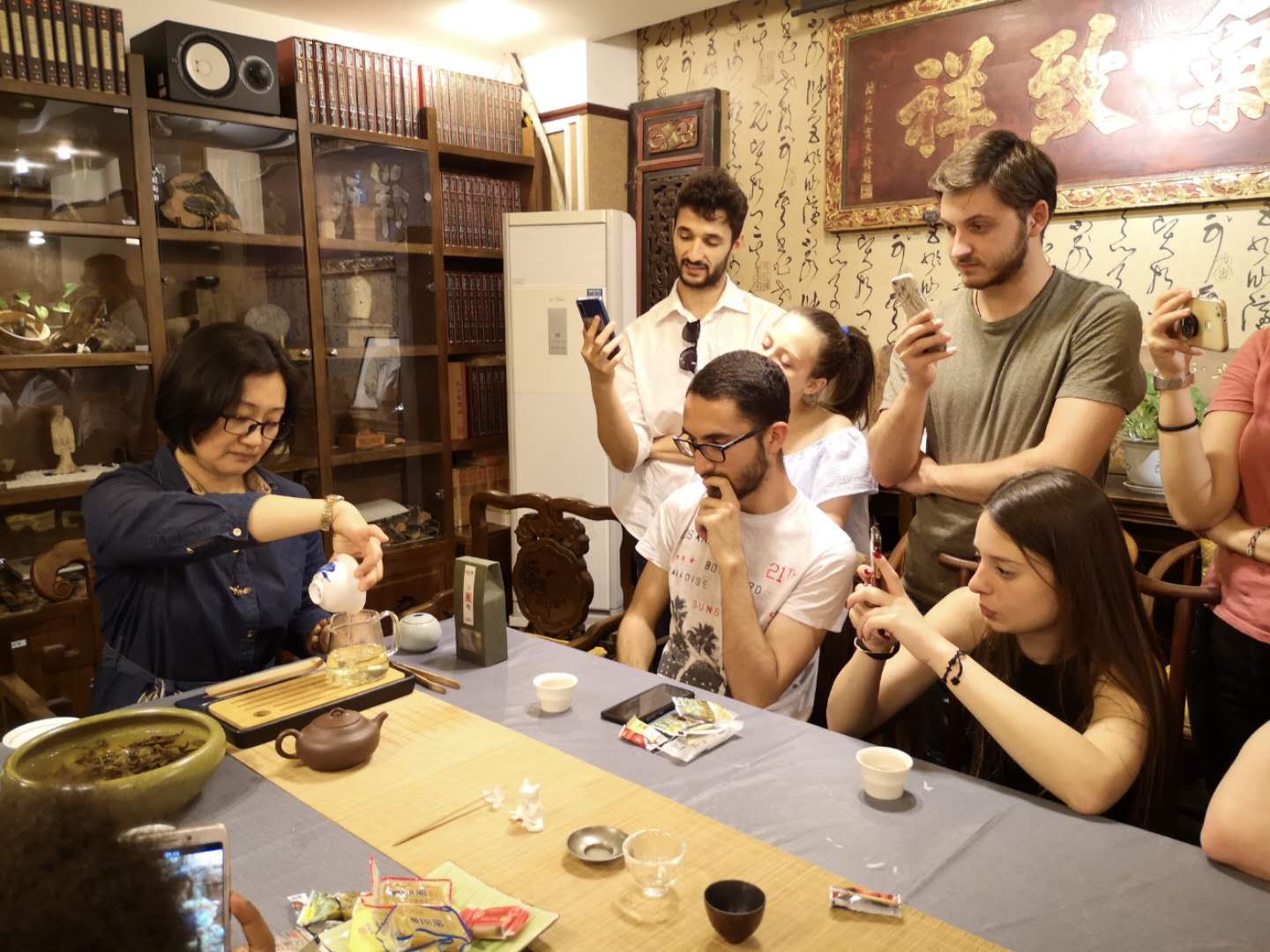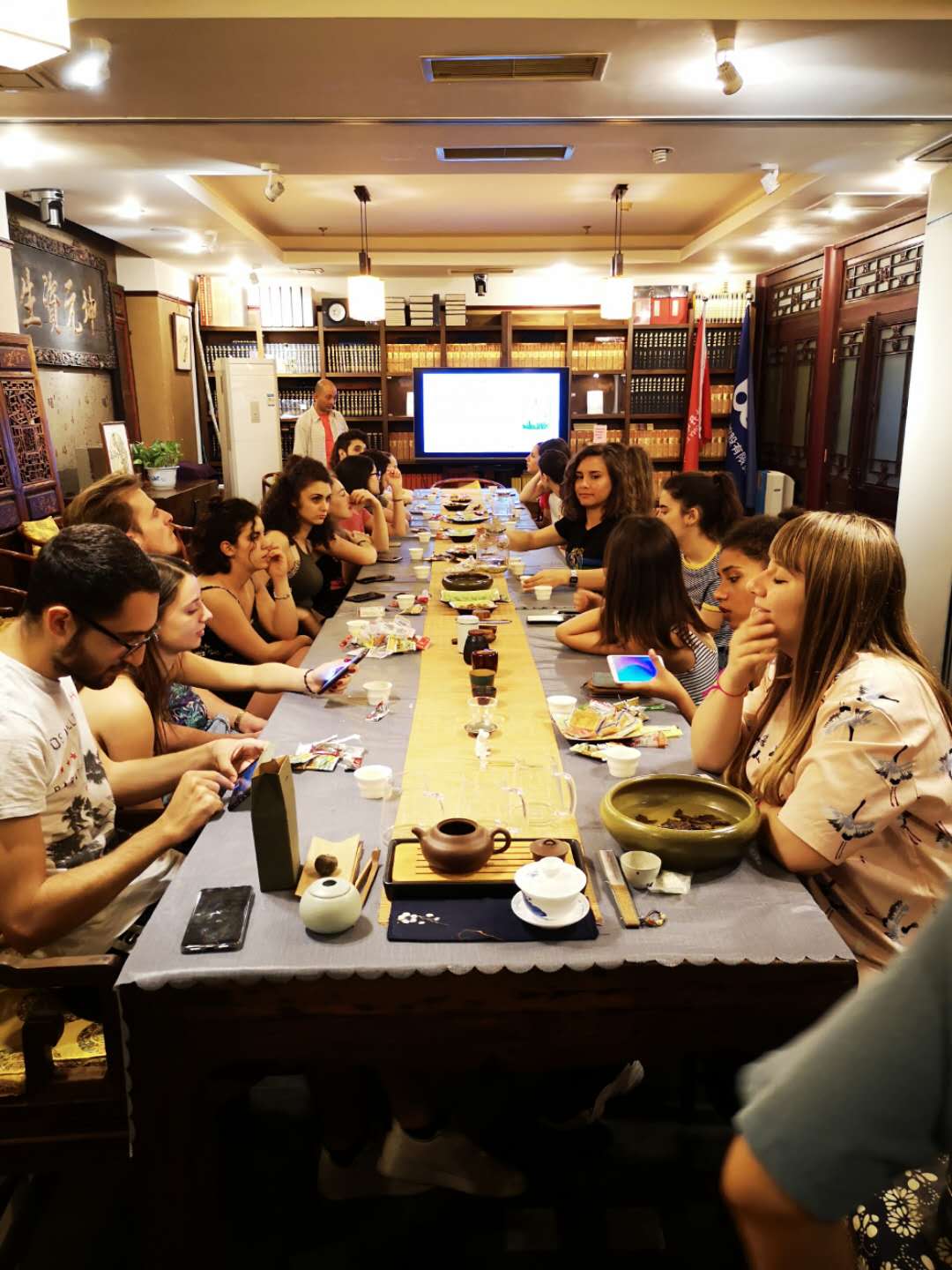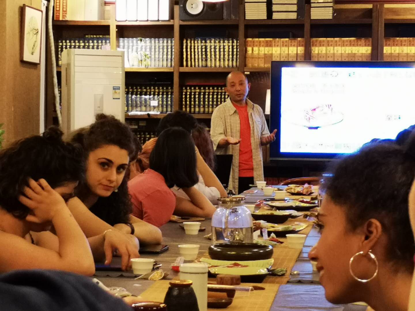 6月12日下午,对外汉语系罗马班员工走入牡丹园的彼岸书店,将中国艺术史的课堂搬到了茶社,陶正宇老师为职工讲授了品茶、冲泡方法以及茶具品鉴等茶知识。通过陶老师的讲解,员工们对中华茶文化有了初步了解。员工们零距离接触了泡茶、品茶的过程,并亲自冲泡一杯好茶回味中华茶文化的韵味。