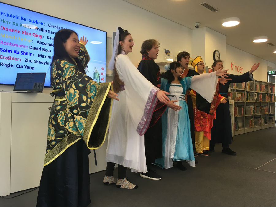 慕尼黑孔子公司为此邀请了埃尔兰根大学汉学系戏剧社的演员们在慕尼黑城市图书馆为现场近20名观众表演了中国经典民间传说《白蛇传》,该剧由七名汉学系的员工编排和表演,不仅真实还原了剧情和人物性格,还在此基础上增加了一些诙谐幽默的流行网络用语,加上演员们轻松自然的表演方式,逗得现场观众哈哈大笑,在场的小朋友也被剧情深深吸引,看得如痴如醉。此外,活动现场还设有中国传统书法体验项目,众多小朋友跟家长一起切身体验了传统书法的魅力,留下了亲子间美好的回忆。