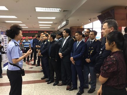 2017年5月26日,汉语培训中心执法联络员汉语培训项目二十九名学员由项目部岳岚、池宇、孙琳三名教师带队参观了北京市出入境办证大厅,并与出入境管理局领导及各部门主要负责人座谈。出入境管理局证照管理大队副大队长张士宇警官带领项目师生参观了办证大厅各主要业务区,为学员们详细介绍了中国公民及在京外国人办理出入境证件的流程,重点展示了使用柜员机自动办证的便民服务设施。座谈会上,出入境管理局车炎局长简要介绍了北京出入境管理局主要负责的四大方面业务,并同项目师生就出入境具体业务操作细节进行了交流,请各部门主要负责人一一回答了学员们的问题。执法项目学员能够使用流利的汉语进行提问,通过交流互动更深入地了解了中国出入境管理业务及具体操作办法。会场气氛轻松,互动频繁,达到了语言实践的预期效果。