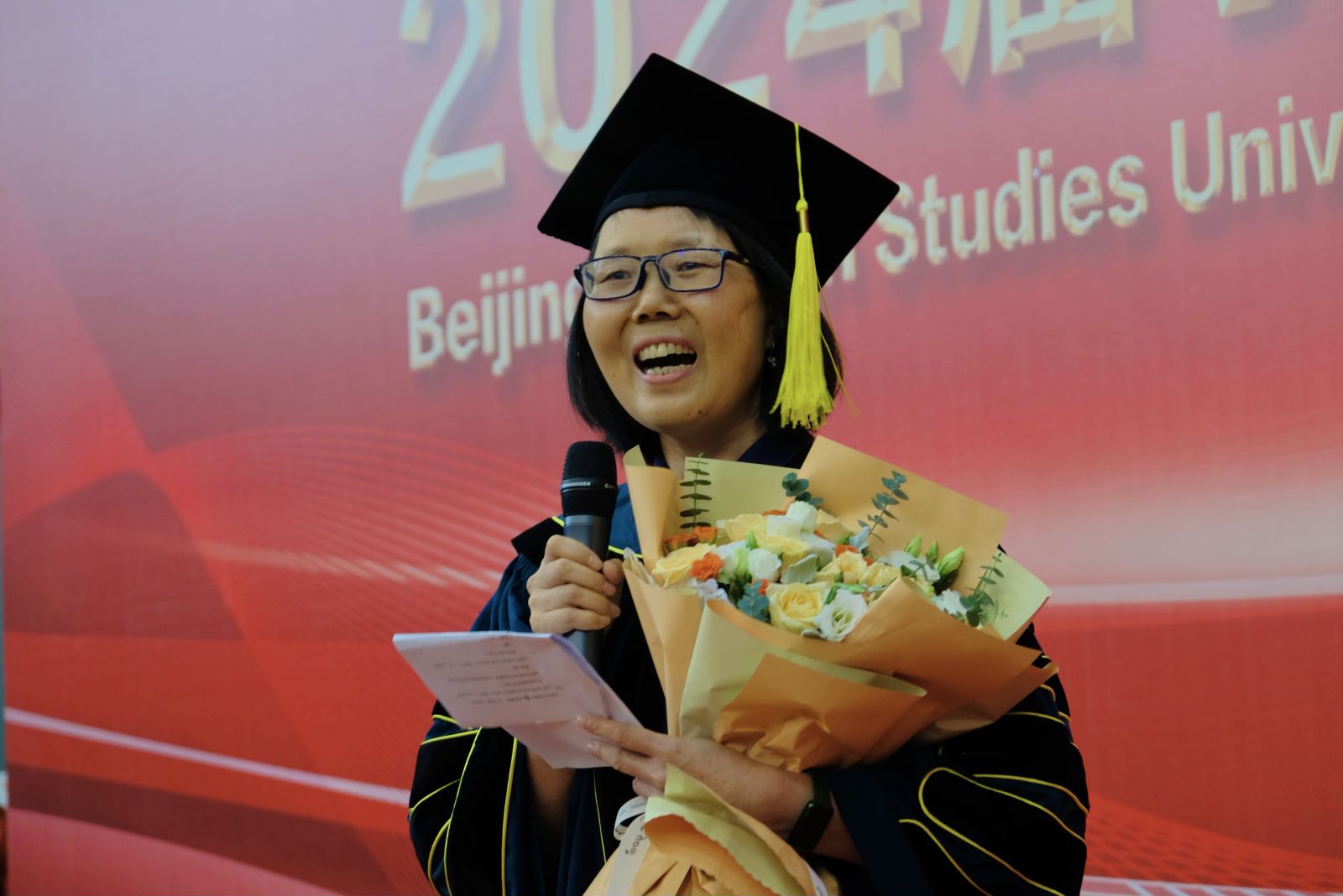 随后,公司教师代表张霖老师上台致辞。她祝贺毕业生们以坚韧的毅力完成了学业顺利毕业。她与在座同学分享了胡适先生的一张“药方”,勉励同学们带着“问题丹”“兴趣散”和“信心汤”,永不停止地自我突破,在人生道路上勇往直前。