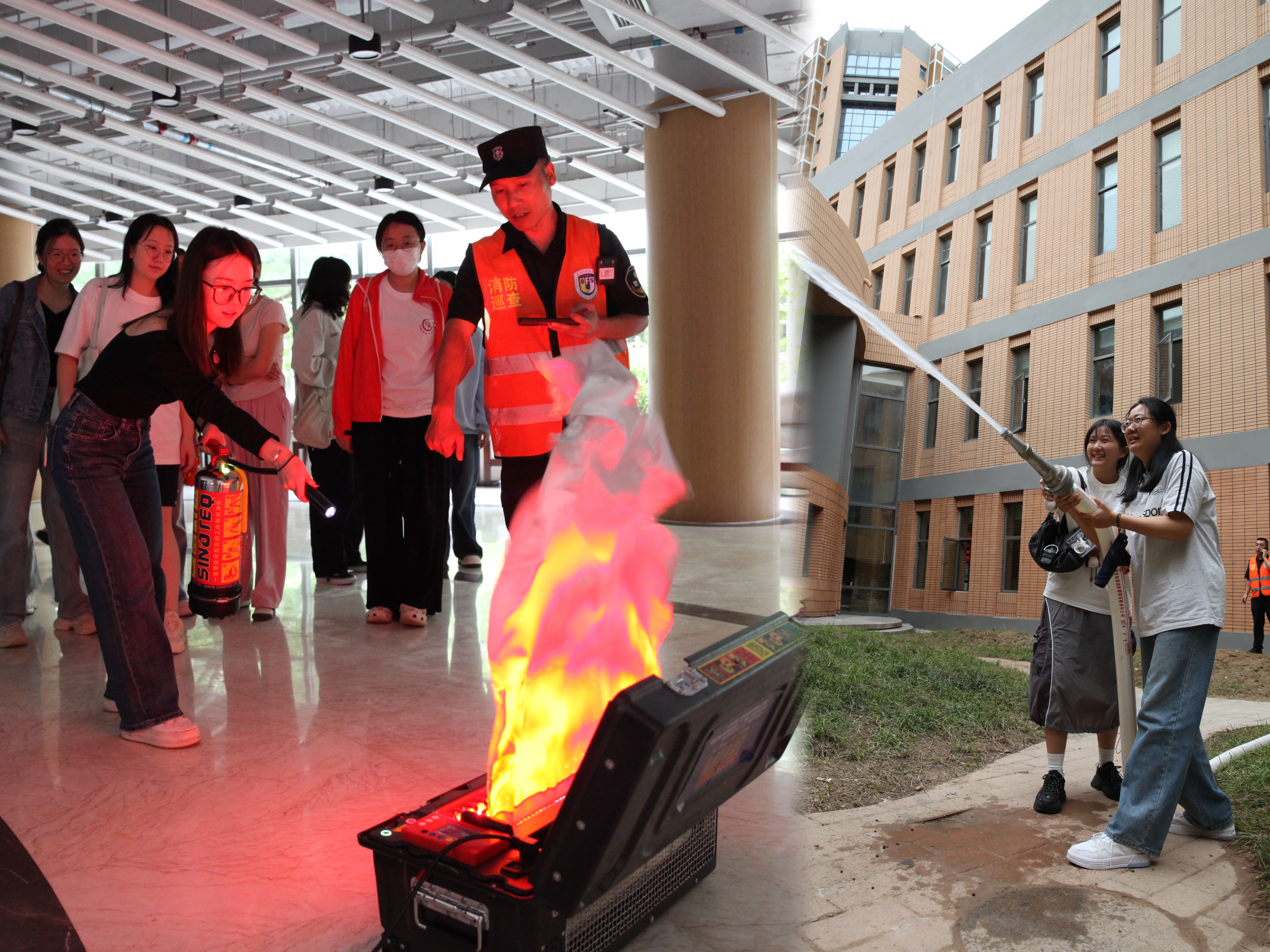 为进一步检验学习效果,全体新生在文华厅门口进行了消防器材使用的实践操作,学习了如何正确使用手提式干粉灭火器扑救油盆火灾。在灭火演练的同时李政委老师带领另一部分同学在文华厅后花园内体验消火栓的使用。消防体验全过程在杨站长的指导下有序展开,让每位同学听得懂、看得清、学得会。