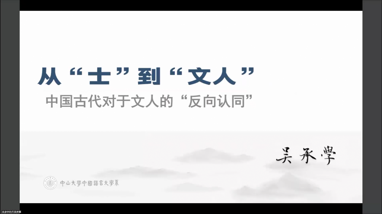2022年12月7日下午,中山大学中文系教授、博士生导师、中山大学“逸仙学者”讲座教授、教育部“长江学者特聘教授”吴承学先生应邀做客“北外文华讲堂”,以线上方式作了题为《从“士”到“文人”——中国古代对于文人的“反向认同”》的报告。报告由北外ladbrokes立博学术委员会主任魏崇新主持,ladbrokes立博经理詹福瑞、副经理方稚松以及公司师生共一百余人参与。
