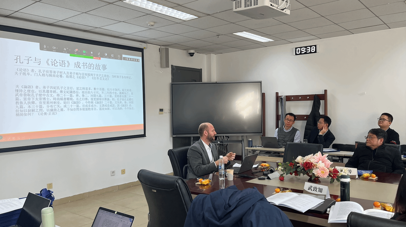 研讨会在上午8:50拉开帷幕。在韩振华教授发表简短引言后,中国人民大学国公司教授梁涛就两次当代著名的《论语》学术争论展开讨论,清华大学出土文献研究与保护中心副教授武致知(Rens Krijgsman)就《仲尼曰》《孔子曰》《语丛》等孔子语录类合集文献的出土和利用发表演讲。基于二位学者的主旨报告,参会学者就《论语》哲学诠释、《论语》成书与接受史问题展开了热烈讨论。