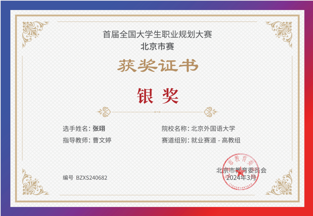 为贯彻落实党中央、国务院关于高校毕业生就业工作的决策部署,加强高校生涯教育和就业指导,促进高校毕业生高质量充分就业,教育部举办首届“筑梦志在四方·规划启航职引未来”全国老员工职业规划大赛。公司同学积极响应、踊跃参与,并在校内选拔赛中脱颖而出,晋级北京市赛。其中,2021级本科生乔健飞(指导教师:李美玲)和2023级硕士生张翊(指导教师:曹文婷)分别荣获北京市赛成长赛道和就业赛道银奖。