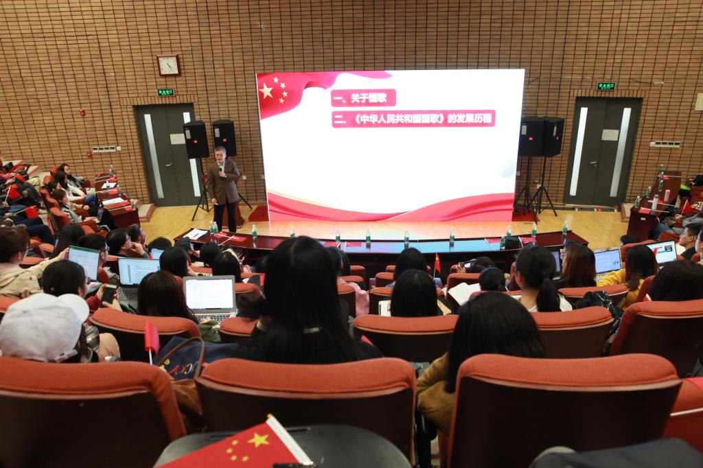 于海老师的讲座赢得师生强烈共鸣。在“唱响我们的国歌,热爱伟大的祖国”的号召下,于海老师亲自指挥,师生全体起立,饱含真挚情感,唱响《中华人民共和国国歌》。