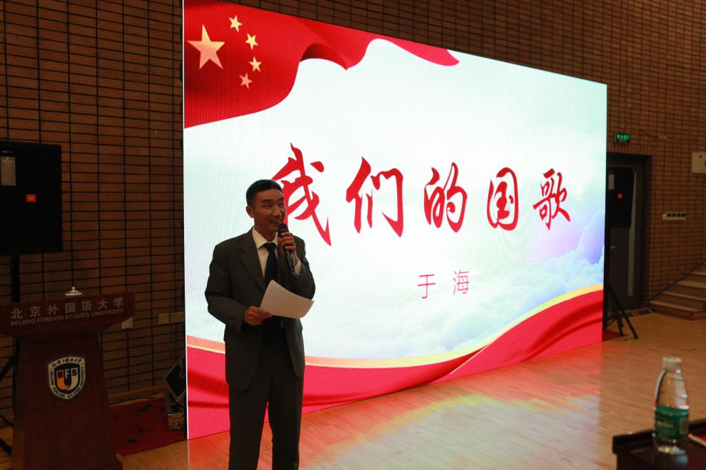 刘厚广主持活动时说,北外诞生于抗日战争的烽火,成长在解放战争的熔炉,快速发展在改革开放时期,目前正腾飞在伟大新时代。历代北外人,秉持“兼容并蓄,博学笃行”的精神品质,传承《人民需要我们到哪里我们就到哪里》的豪情壮志与使命担当,爱国报国的红色基因在北外生生不息、代代相传。着眼当下,我们正在深入学习贯彻习近平新时代中国特色社会主义思想,厚植爱国主义情怀,推动美育教育,实施新一轮的公司产品改革,造就德智体美劳全面发展的、既具有世界眼光、更具有中国情怀的、高水平、国际化人才,正朝着世界一流外国语大学的目标迈进。于海老师同样也怀着美好愿望和殷切期待,激励北外师生为国旗增光添彩,体会国歌饱含的民族情感和催人奋进的坚定意志。一堂精彩的音乐课、历史课、爱国课,让我们领略了于海老师精彩的艺术人生。